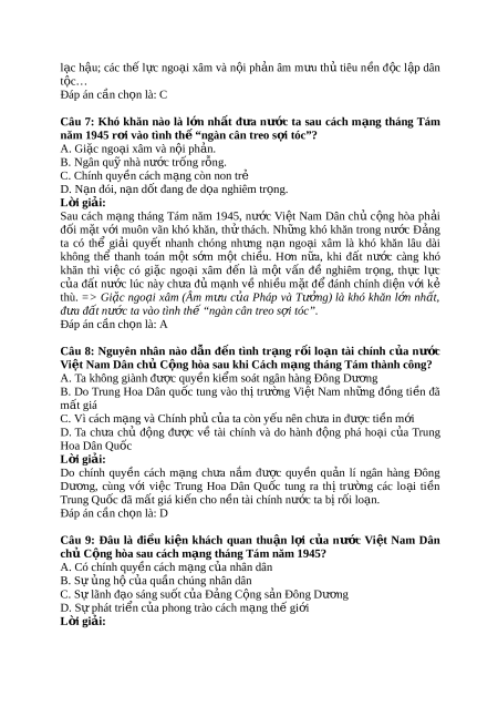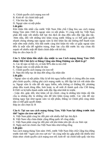 ạ xâm là khó khăn lâu dài không thể thanh toán m t ộ s m ớ m t ộ chi u. ề Khi đ t ấ nư c ớ càng khó khăn thì vi c ệ có gi c ặ ngo i ạ xâm đ n ế là m t ộ v n ấ đề nghiêm tr ng, ọ th c ự l c ự c a ủ đ t ấ nư c ớ lúc này ch a ư đủ m nh ạ v nhi ề u m ề t ặ đ đánh ể chính di n v ệ i ớ k t ẻ hù. Đáp án c n ch ầ n l ọ à: D Câu 5: Khó khăn l n ớ nh t ấ c a ủ nư c ớ ta sau Cách m ng ạ tháng Tám 1945 đư c H ợ ồ Chủ t ch và Đ ị ảng C ng s ộ n Đ ả ông Dư ng xác đ ơ nh l ị à gì? A. Các t n ệ n xã h ạ i ộ cũ, có h n 90% ơ dân ta mù chữ B. Ngo i ạ xâm và n i ộ ph n đe d ả a ọ C. Chính quy n cách ề m ng còn non t ạ rẻ D. N n ạ đói ti p t ế c đe d ụ a ọ đ i ờ s ng c ố a nhân ủ dân L i ờ giải: - Ngo i ạ xâm và n i ộ ph n: ả Đây là k ẻ thù nguy hi m ể nh t ấ vì chúng đ u âm ề m u ư phá chính quy n, ề ch ng ố phá cách m ng ạ nư c ớ ta, đ i ố l p ậ l i ợ ích v i ớ nhân dân ta. Ngo i ạ xâm là v n ấ đề r t ấ nguy hi m ể , n u ế không có đư ng ờ l i ố , phư ng ơ pháp đ u ấ tranh đúng đ n, ắ linh ho t ạ , ta sẽ m t ấ đi thành quả c a ủ CM tháng 8/1945 và bị bi n t ế hành nư c ớ m t ấ đ c ộ l p nh ậ t ư h i ờ kì trư c. ớ - Giặc đói, gi c ặ d t