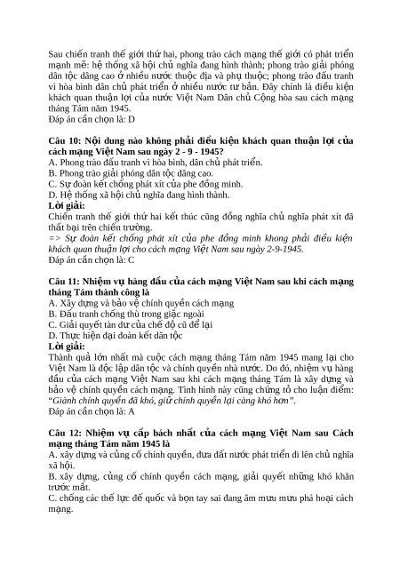 vì hòa bình dân chủ phát tri n ể ở nhi u ề nư c ớ tư b n. ả Đây chính là đi u ề ki n ệ khách quan thu n ậ l i ợ c a ủ nư c ớ Vi t ệ Nam Dân chủ C ng ộ hòa sau cách m ng ạ tháng Tám năm 1945. Đáp án c n ch ầ n l ọ à: D Câu 10: N i