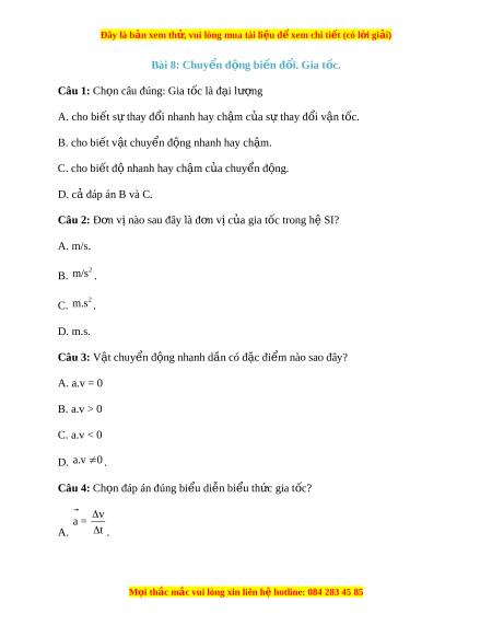 Đây là bản xem th , vu ử i lòng mua tài li u ệ đ xe ể m chi ti t (c ế ó l i ờ gi i ả ) Bài 8: Chuy n đ ể ng bi ộ n đ ế i ổ . Gia t c. ố Câu 1: Ch n câu ọ đúng: Gia t c ố là đ i ạ lư ng ợ A. cho bi t ế s t ự hay đổi nhanh hay ch m ậ c a s ủ ự thay đổi v n t ậ ốc. B. cho bi t ế v t ậ chuy n ể đ ng nhanh hay ch ộ m ậ . C. cho bi t ế đ nhanh hay ch ộ m ậ c a ủ chuy n đ ể ng. ộ D. c đáp án B ả và C. Câu 2: Đ n v ơ ị nào sau đây là đ n v ơ c ị a gi ủ a t c t ố rong h S ệ I? A. m/s. B. 2 m/s . C. 2 m.s . D. m.s. Câu 3: V t ậ chuy n ể đ ng nhanh d ộ n có đ ầ c ặ đi m ể nào sao đây? A. a.v = 0 B. a.v > 0 C. a.v < 0 D. a.v 0 . Câu 4: Ch n đáp ọ án đúng bi u di ể n bi ễ u t ể h c gi ứ a tốc? v a = A. t . M i