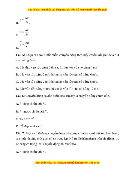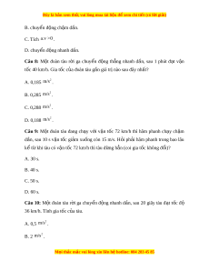 Đây là bản xem th , vu ử i lòng mua tài li u ệ đ xe ể m chi ti t (c ế ó l i ờ gi i ả ) v a = B. t . v a = C. t . d a = D. t . Câu 5: Ch n ọ câu sai: Ch t ấ đi m ể chuy n ể đ ng ộ theo m t ộ chi u ề v i ớ gia t c ố a = 4 m/s2 có nghĩa là A. Lúc đ u v ầ n t ậ ốc b ng ằ 0 thì sau 1s v n t ậ c c ố a nó b ủ ng ằ 4 m/s. B. Lúc v n ậ tốc b ng 2 m ằ /s thì sau 1s v n ậ t c c ố a nó b ủ ng ằ 6 m/s. C. Lúc v n ậ tốc b ng 2 m ằ /s thì sau 2s v n ậ t c c ố a nó b ủ ng ằ 8 m/s. D. Lúc v n ậ tốc b ng ằ 4 m/s thì sau 2s v n ậ t c c ố a ủ nó b ng 12 m ằ /s. Câu 6: Chuy n đ ể ng ộ có đ c đi ặ m