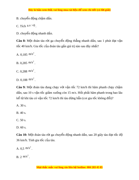 Đây là bản xem th , vu ử i lòng mua tài li u ệ đ xe ể m chi ti t (c ế ó l i ờ gi i ả ) B. chuy n đ ể ng ch ộ m ậ d n. ầ C. Tích a.v >0 . D. chuy n ể đ ng nhanh d ộ n. ầ Câu 8: M t ộ đoàn tàu r i ờ ga chuy n ể đ ng ộ th ng ẳ nhanh d n, ầ sau 1 phút đ t ạ v n ậ