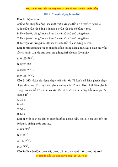 Đây là bản xem th , vu ử i lòng mua tài li u ệ đ xe ể m chi ti t ế (có l i ờ gi i ả ) Bài 4. Chuy n đ ể ng bi ộ n đ ế i ổ Câu 1: Ch n ọ câu sai. Chất đi m ể chuy n đ ể ng t ộ heo m t ộ chi u v ề i ớ gia t c a = 4 m ố /s2 có nghĩa là A. lúc đầu v n t ậ ốc b ng 0 t ằ hì sau 1 s v n ậ tốc c a nó b ủ ng ằ 4 m/s. B. lúc v n ậ tốc b ng 2 m ằ /s thì sau 1 s v n ậ t c ố c a nó b ủ ng ằ 6 m/s. C. lúc v n ậ tốc b ng 2 m ằ /s thì sau 2 s v n ậ t c ố c a nó b ủ ng ằ 8 m/s. D. lúc v n t ậ ốc b ng ằ 4 m/s thì sau 2 s v n ậ t c c ố a ủ nó b ng 12 m ằ /s. Câu 2: M t ộ đoàn tàu r i ờ ga chuy n ể đ ng ộ th ng ẳ nhanh d n, ầ sau 1 phút đ t ạ v n ậ tốc 40 km/h. Gia t c c ố a ủ đoàn tàu g n gi ầ á tr nào s ị au đây nh t ấ ? A. 0,185 2 m/s . B. 0,285 2 m/s . C. 0,288 2 m/s . D. 0,188 2 m/s . Câu 3: M t ộ đoàn tàu đang ch y ạ v i ớ v n ậ t c