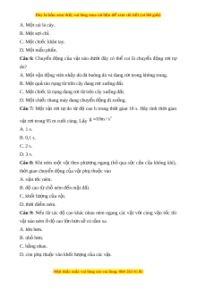 ớ đây có thể coi là chuy n ể đ ng ộ r i ơ tự do? A. M t ộ v n ậ đ ng vi ộ ên nh y dù đã ả buông dù và đang r i ơ trong không trung. B. M t ộ quả táo r ng t ụ t ừ rên cây đang r i ơ xu ng đ ố t ấ . C. M t ộ chi c ế lá r ng đang r ụ i ơ t t ừ rên cây xu ng đ ố t ấ . D. M t ộ chi c t ế hang máy đang chuy n đ ể ng đi ộ xu ng. ố Câu 7: M t ộ v t ậ r i