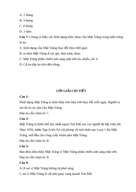 ầ Trăng tròn liên ti p cách nhau bao ế nhiêu tu n? ầ A. 2 tuần B. 4 tuần C. 6 tuần D. 8 tuần Câu 6: M t ặ Trăng quay m t ộ vòng quanh Trái Đ t ấ m t ấ th i ờ gian kho ng bao ả lâu? A. 1 tháng B. 3 tháng C. 6 tháng D. 1 năm