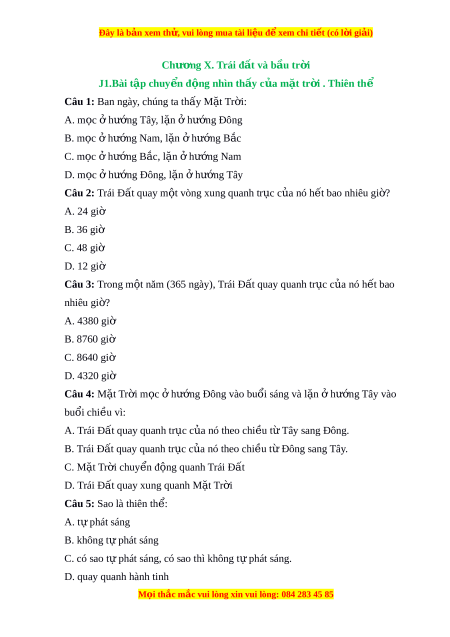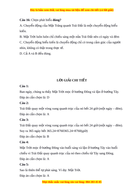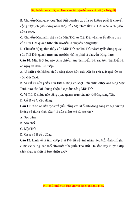 Đây là bản xem th , vu ử i lòng mua tài li u ệ đ xe ể m chi ti t ế (có l i ờ gi i ả ) B. Chuy n ể đ ng quay c ộ a ủ Trái Đ t ấ quanh tr c c ụ a ủ nó không ph i ả là chuy n ể đ ng t ộ h c, chuy ự n ể đ ng nhì ộ n th y c ấ a ủ M t ặ Tr i ờ t ừ Trái Đ t ấ m i ớ là chuy n ể đ ng t ộ h c. ự C. Chuy n ể đ ng nhì ộ n th y c ấ a M ủ t ặ Tr i ờ t ừ Trái Đ t ấ và chuy n đ ể ng quay ộ c a ủ Trái Đất quanh tr c ụ c a nó đ ủ u l ề à chuy n đ ể ng t ộ h c. ự D. Chuy n đ ể ng ộ nhìn th y c ấ a ủ M t ặ Tr i ờ từ Trái Đ t ấ và chuy n ể đ ng quay ộ c a ủ Trái Đất quanh tr c ụ c a nó đ ủ u không ph ề i ả là chuy n đ ể ng ộ th c. ự Câu 10: M t ặ Tr i ờ lúc nào cũng chi u ế sáng Trái Đ t ấ . T i ạ sao trên Trái Đ t ấ l i ạ