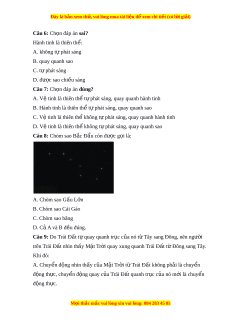 Đây là bản xem th , vu ử i lòng mua tài li u ệ đ xe ể m chi ti t ế (có l i ờ gi i ả ) Câu 6: Ch n ọ đáp án sai? Hành tinh là thiên th : ể A. không t phát ự sáng B. quay quanh sao C. t phát ự sáng D. đư c s ợ ao chi u s ế áng Câu 7: Ch n ọ đáp án đúng? A. Vệ tinh là thiên th t ể phát ự sáng, quay quanh hành tinh