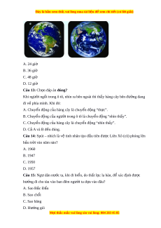 Câu 2: Trái Đất quay m t ộ vòng xung quanh tr c ụ c a nó h ủ t ế bao nhiêu gi ? ờ A. 24 giờ B. 36 giờ C. 48 giờ D. 12 giờ Câu 3: Trong m t