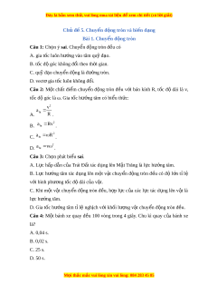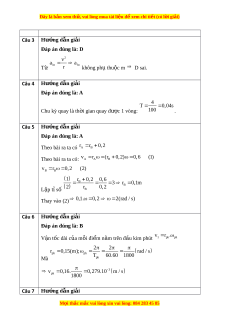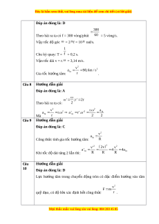 Đây là bản xem th , vu ử i lòng mua tài li u ệ đ xe ể m chi ti t (c ế ó l i ờ gi i ả ) Câu 3 Hư ng d ớ ẫn gi i ả Đáp án đúng là: D 2 v a a T ừ ht ht r không ph t ụ hu c m ộ D sai. Câu 4 Hư ng d ớ ẫn gi i ả Đáp án đúng là: A 4 T 0 ,04s Chu kỳ quay là th i ờ gian quay đư c ợ 1 vòng: 100 . Câu 5 Hư ng d ớ ẫn gi i ả Đáp án đúng là: A Theo bài ra ta có r r 0, 2 A B Theo bài ra ta có: v r ( r 0, 2) 0 ,6 (1) A A B v r 0 , 2 (2) B B 1 r 0,2 0,6 B 3 r 0 ,1m B L p t ậ ỉ số 2 r 0,2 B Thay vào (2) 0,1. 0 , 2 2 (rad / s) Câu 6 Hư ng d ớ ẫn gi i ả Đáp án đúng là: B v r . V n ậ tốc dài c a m ủ ỗi đi m ể n m ằ trên đ u k ầ im phút 1 ph ph 2 2 r 0,15(m); rad / s ph ph T 60.60 1800 Mà ph 3 v 0 ,16. 0 , 279.10 m / s ph 1800 Câu 7 Hư ng d ớ ẫn gi i ả M i ọ thắc m c