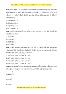 Đây là bản xem th , vu ử i lòng mua tài li u ệ đ xe ể m chi ti t (c ế ó l i ờ gi i ả ) Câu 5: Hai đi m ể A, B n m ằ trên cùng bán kính c a ủ m t ộ vô lăng đang quay đ u ề cách nhau 20 cm. Đi m ể A ở phía ngoài có v n ậ t c ố vA = 0,6 m/s, còn đi m ể B có v n ậ t c ố vB = 0,2 m/s. Tính v n ậ t c ố góc c a ủ vô lăng và kho ng ả cách t ừ đi m ể B đ n t ế r c quay ụ . A. 2 (rad/s); 0,1 m. B. 1 (rad/s); 0,2 m. C. 3 (rad/s); 0,2 m. D. 0,2 (rad/s); 3 m. Câu 6: Cho m t ộ đ ng ồ hồ treo tư ng