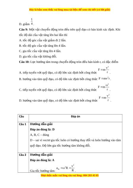 Đây là bản xem th , vu ử i lòng mua tài li u ệ đ xe ể m chi ti t ế (có l i ờ gi i ả ) 1 D. gi m ả 4 . Câu 9: M t ộ v t ậ chuy n ể đ ng ộ tròn đ u ề trên qu ỹ đ o ạ có bán kính xác đ nh. ị Khi tốc đ dài ộ c a v ủ t ậ tăng lên hai l n t ầ hì A. tốc đ góc c ộ a ủ v t ậ gi m ả đi 2 l n. ầ B. tốc đ góc c ộ a ủ v t ậ tăng lên 4 l n. ầ C. gia tốc c a ủ v t ậ tăng lên 4 l n. ầ D. gia tốc c a v ủ t ậ không đổi. Câu 10: L c h ự ư ng ớ tâm trong chuy n đ ể ng ộ tròn đ u bán kí ề nh r, có đ c đi ặ m ể 2 v F m A. ti p t ế uy n v ế i ớ qu đ ỹ o, ạ có đ l ộ n xác ớ đ nh b ị i ở công th c ứ r . B. hư ng ớ vào tâm qu đ ỹ o, có ạ đ l ộ n xác đ ớ nh b ị i ở công th c ứ 2 F m v r . 2 F m C. ti p t ế uy n v ế i ớ quỹ đ o, có đ ạ l ộ n ớ xác đ nh b ị i ở công th c ứ r . 2 v F m D. hư ng vào t ớ âm quỹ đ o, có đ ạ l ộ n ớ xác đ nh b ị i ở công th c ứ r . Câu Đáp án Câu 1 Hư ng ớ d n gi ẫ i ả Đáp án đúng là: D A, B, C – đúng D – sai vì vectơ gia t c ố luôn có hư ng ớ thay đ i ổ và luôn hư ng ớ vào tâm qu đ ỹ o. Đ ạ ộ l n gi ớ a tốc hư ng t ớ âm không đổi. Câu 2 Hư ng ớ d n gi ẫ i ả Đáp án đúng là: A 2 v 2 a R Gia tốc hư ng t ớ âm: ht R . M i