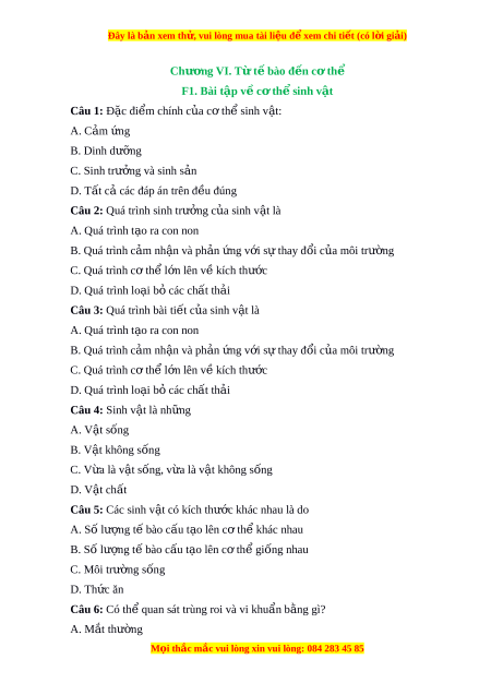 Đây là bản xem th , vu ử i lòng mua tài li u ệ đ xe ể m chi ti t ế (có l i ờ gi i ả ) Chư ng ơ VI. Từ t b ế ào đ n c ế ơ thể F1. Bài tập v c ề t ơ h s ể inh v t ậ Câu 1: Đặc đi m ể chính c a ủ c t ơ h s ể inh v t ậ : A. C m ả ng ứ B. Dinh dư ng ỡ C. Sinh trư ng và s ở inh s n ả