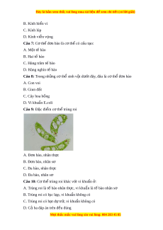Đây là bản xem th , vu ử i lòng mua tài li u ệ đ xe ể m chi ti t ế (có l i ờ gi i ả ) B. Kính hi n vi ể C. Kính lúp D. Kính vi n v ễ ng ọ Câu 7: Cơ th đ ể n bào l ơ à c t ơ h có c ể u t ấ o: ạ A. M t ộ tế bào B. Hai tế bào C. Hàng trăm t bào ế D. Hàng nghìn t bào ế Câu 8: Trong nh ng ữ c t ơ h s ể inh v t ậ dư i ớ đây, đâu là c t ơ h đ ể n bào ơ A. Con voi B. Giun đ t ấ C. Cây hoa hồng D. Vi khuẩn E.coli Câu 9: Đặc đi m ể c t ơ hể trùng roi A. Đ n bào, nhân t ơ h c ự B. Đ n ơ bào, nhân sơ C. Đa bào, nhân th c ự D. Đa bào, nhân sơ Câu 10: Cơ th t ể rùng roi khác v i ớ vi khu n ẩ : ở