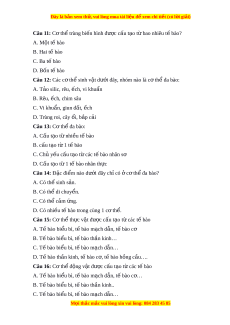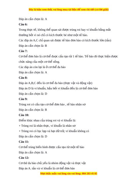 Đây là bản xem th , vu ử i lòng mua tài li u ệ đ xe ể m chi ti t ế (có l i ờ gi i ả ) Câu 11: C t ơ hể trùng bi n hì ế nh đư c ợ c u t ấ o t ạ bao nhi ừ êu t bào? ế A. M t ộ tế bào B. Hai tế bào C. Ba t bào ế D. Bốn t bào ế Câu 12: Các c t ơ hể sinh v t ậ dư i ớ đây, nhóm nào là c t ơ h đa ể bào: A. T o s ả ilic, rêu, ch, vi ế khu n ẩ B. Rêu, ch, chi ế m sâu C. Vi khuẩn, giun đ t ấ , ch ế D. Trùng roi, cây i ổ , b p ắ c i ả
