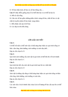 D. Các đáp án trên đ u đúng ề L I Ờ GIẢI CHI TI T Ế Câu 1: C t ơ hể ch m ỉ t ộ cá th s ể inh v t ậ có kh năng ả th c hi ự n các quá t ệ rình s ng c ố ơ b n: ả c m ả ng, di ứ nh dư ng, s ỡ inh trư ng ở và sinh s n,ch ả t ế .. Đáp án cần ch n ọ là: D Câu 2: Quá trình sinh trư ng ở c a s ủ inh v t ậ là quá trình c t ơ h l ể n l ớ ên v kí ề ch thư c ớ Đáp án cần ch n ọ là: C Câu 3: Quá trình bài ti t ế c a ủ sinh v t ậ là quá trình lo i ạ b các ỏ ch t ấ th i ả Đáp án cần ch n ọ là: D Câu 4: Sinh v t ậ là nh ng v ữ t ậ s ng có kh ố năng ả th c hi ự n các quá t ệ rình s ng c ố b ơ n: ả c m ả ng, ứ dinh dư ng, ỡ sinh trư ng và s ở inh s n.. ả Đáp án cần ch n ọ là: A Câu 5: Các sinh v t