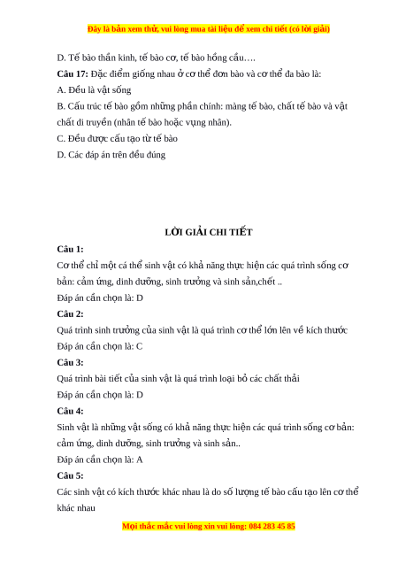 Đây là bản xem th , vu ử i lòng mua tài li u ệ đ xe ể m chi ti t ế (có l i ờ gi i ả ) D. T bào ế th n ki ầ nh, t bào c ế , ơ t bào h ế ng c ồ u…. ầ Câu 17: Đặc đi m ể giống nhau c ở t ơ hể đ n bào và c ơ ơ thể đa bào là: A. Đ u l ề à v t ậ sống B. Cấu trúc t bào g ế ồm nh ng ph ữ n chí ầ nh: màng t bào, ch ế t ấ t bào và v ế t ậ chất di truy n ( ề nhân t bào ho ế c ặ v ng nhân) ụ . C. Đ u ề đư c c ợ ấu t o t ạ ừ t bào ế