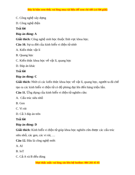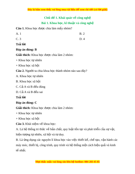 Đây là bản xem th , vu ử i lòng mua tài li u ệ đ xe ể m chi ti t (c ế ó l i ờ gi i ả ) Chủ đ 1. K ề hái quát v công ngh ề ệ Bài 1. Khoa h c, kĩ ọ thu t ậ và công nghệ Câu 1. Khoa h c đ ọ ư c ợ chia làm m y nhóm ấ ? A. 1 B. 2 C. 3 D. 4 Trả l i ờ Đáp án đúng: B