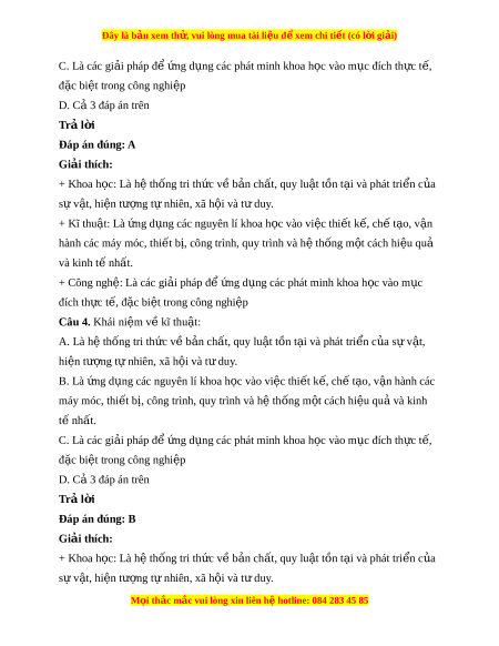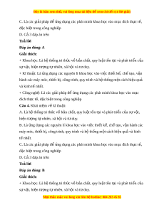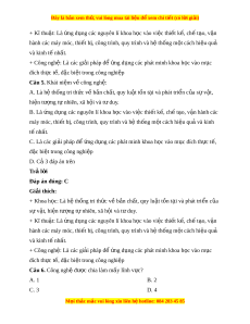 Đây là bản xem th , vu ử i lòng mua tài li u ệ đ xe ể m chi ti t (c ế ó l i ờ gi i ả ) C. Là các gi i ả pháp để ng d ứ ng các phát ụ minh khoa h c ọ vào m c đí ụ ch th c ự t , ế đ c ặ bi t ệ trong công nghi p ệ D. C 3 đáp án ả trên Trả l i ờ Đáp án đúng: A Giải thích: + Khoa h c: ọ Là h t ệ h ng t ố ri th c ứ v b ề n ch ả t ấ , quy lu t ậ t n t ồ i ạ và phát tri n c ể a ủ sự v t ậ , hiện tư ng t ợ ự nhiên, xã h i ộ và t duy ư . + Kĩ thu t ậ : Là ng d ứ ng các ụ nguyên lí khoa h c ọ vào vi c ệ thi t ế k , ch ế t ế o, v ạ n ậ hành các máy móc, thi t ế b , công t ị rình, quy trình và h t ệ h ng m ố t ộ cách hi u qu ệ ả và kinh t nh ế ất. + Công ngh : ệ Là các gi i ả pháp đ ể ng d ứ ng ụ các phát minh khoa h c ọ vào m c ụ đích th c ự t , đ ế c bi ặ t ệ trong công nghi p ệ Câu 4. Khái ni m ệ v kĩ ề thu t ậ : A. Là h t ệ hống tri th c v ứ b ề n ả ch t ấ , quy lu t ậ t n t ồ i ạ và phát tri n c ể a s ủ v ự t ậ , hiện tư ng t ợ nhi ự ên, xã h i ộ và t duy ư . B. Là ng ứ d ng các nguyên l ụ í khoa h c ọ vào vi c t ệ hi t ế k , ch ế t ế o, ạ v n hành các ậ máy móc, thi t ế b , công t ị rình, quy trình và h t ệ h ng m ố t ộ cách hi u qu ệ và ki ả nh t nh ế ất. C. Là các gi i ả pháp để ng d ứ ng các phát ụ minh khoa h c ọ vào m c đí ụ ch th c ự t , ế đ c ặ bi t ệ trong công nghi p ệ D. C 3 đáp án ả trên Trả l i ờ Đáp án đúng: B Giải thích: + Khoa h c: ọ Là h t ệ h ng t ố ri th c ứ v b ề n ch ả t ấ , quy lu t ậ t n t ồ i ạ và phát tri n c ể a ủ sự v t ậ , hiện tư ng t ợ ự nhiên, xã h i ộ và t duy ư . M i