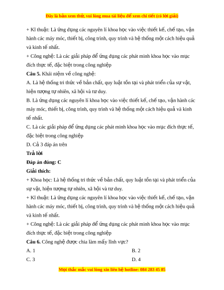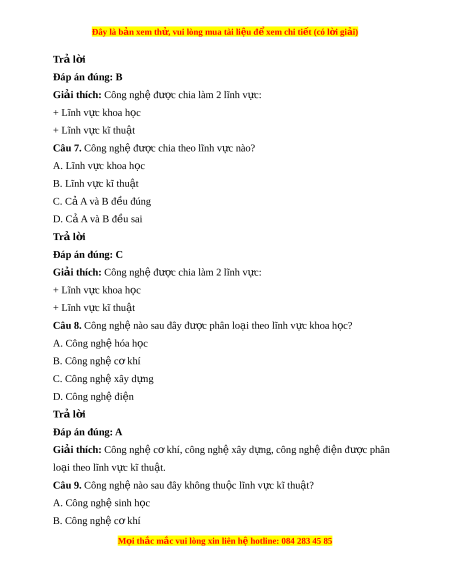 Đây là bản xem th , vu ử i lòng mua tài li u ệ đ xe ể m chi ti t (c ế ó l i ờ gi i ả ) + Kĩ thu t ậ : Là ng d ứ ng các ụ nguyên lí khoa h c ọ vào vi c ệ thi t ế k , ch ế t ế o, v ạ n ậ hành các máy móc, thi t ế b , công t ị rình, quy trình và h t ệ h ng m ố t ộ cách hi u qu ệ ả và kinh t nh ế ất. + Công ngh : ệ Là các gi i ả pháp đ ể ng d ứ ng ụ các phát minh khoa h c ọ vào m c ụ đích th c ự t , đ ế c bi ặ t ệ trong công nghi p ệ Câu 5. Khái ni m ệ v công ngh ề : ệ A. Là h t ệ hống tri th c v ứ b ề n ả ch t ấ , quy lu t ậ t n t ồ i ạ và phát tri n c ể a s ủ v ự t ậ , hiện tư ng t ợ nhi ự ên, xã h i ộ và t duy ư . B. Là ng ứ d ng các nguyên l ụ í khoa h c ọ vào vi c t ệ hi t ế k , ch ế t ế o, ạ v n hành các ậ máy móc, thi t ế b , công t ị rình, quy trình và h t ệ h ng m ố t ộ cách hi u qu ệ và ki ả nh t nh ế ất. C. Là các gi i ả pháp để ng d ứ ng các phát ụ minh khoa h c ọ vào m c đí ụ ch th c ự t , ế đ c ặ bi t ệ trong công nghi p ệ D. C 3 đáp án ả trên Trả l i ờ Đáp án đúng: C Giải thích: + Khoa h c: ọ Là h t ệ h ng t ố ri th c ứ v b ề n ch ả t ấ , quy lu t ậ t n t ồ i ạ và phát tri n c ể a ủ sự v t ậ , hiện tư ng t ợ ự nhiên, xã h i ộ và t duy ư . + Kĩ thu t ậ : Là ng d ứ ng các ụ nguyên lí khoa h c ọ vào vi c ệ thi t ế k , ch ế t ế o, v ạ n ậ hành các máy móc, thi t ế b , công t ị rình, quy trình và h t ệ h ng m ố t ộ cách hi u qu ệ ả và kinh t nh ế ất. + Công ngh : ệ Là các gi i ả pháp đ ể ng d ứ ng ụ các phát minh khoa h c ọ vào m c ụ đích th c ự t , đ ế c bi ặ t ệ trong công nghi p ệ Câu 6. Công ngh đ ệ ư c chi ợ a làm m y l ấ ĩnh v c? ự A. 1 B. 2 C. 3 D. 4 M i