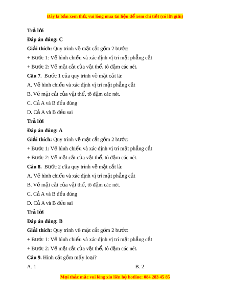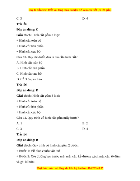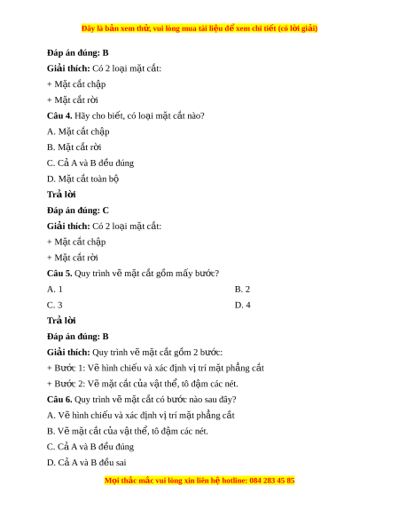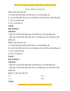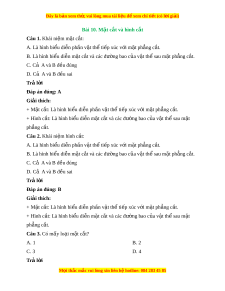 Đây là bản xem th , vu ử i lòng mua tài li u ệ đ xe ể m chi ti t (c ế ó l i ờ gi i ả ) Bài 10. M t ặ cắt và hình c t ắ Câu 1. Khái ni m ệ m t ặ c t ắ : A. Là hình bi u di ể n ph ễ n v ầ t ậ th t ể i p xúc ế v i ớ m t ặ ph ng ẳ c t ắ . B. Là hình bi u di ể n m ễ t ặ c t ắ và các đư ng bao ờ c a v ủ t ậ th s ể au m t ặ ph ng c ẳ t ắ . C. Cả A và B đ u đúng ề D. C ả A và B đ u s ề ai Trả l i ờ Đáp án đúng: A Giải thích: + M t ặ c t ắ : Là hình bi u di ể n ph ễ n v ầ t ậ thể ti p ế xúc v i ớ m t ặ ph ng ẳ c t ắ . + Hình c t ắ : Là hình bi u di ể n m ễ t ặ c t ắ và các đư ng bao ờ c a v ủ t ậ th s ể au m t ặ ph ng ẳ c t ắ . Câu 2. Khái ni m ệ hình c t ắ : A. Là hình bi u di ể n ph ễ n v ầ t ậ th t ể i p xúc ế v i ớ m t ặ ph ng ẳ c t ắ . B. Là hình bi u di ể n m ễ t ặ c t ắ và các đư ng bao ờ c a v ủ t ậ th s ể au m t ặ ph ng c ẳ t ắ . C. Cả A và B đ u đúng ề D. C ả A và B đ u s ề ai Trả l i ờ Đáp án đúng: B Giải thích: + M t ặ c t ắ : Là hình bi u di ể n ph ễ n v ầ t ậ thể ti p ế xúc v i ớ m t ặ ph ng ẳ c t ắ . + Hình c t ắ : Là hình bi u di ể n m ễ t ặ c t ắ và các đư ng bao ờ c a v ủ t ậ th s ể au m t ặ ph ng ẳ c t ắ . Câu 3. Có mấy lo i ạ m t ặ c t ắ ? A. 1 B. 2 C. 3 D. 4 Trả l i ờ M i