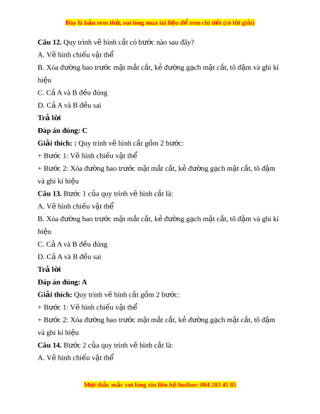 Giải thích: Quy trình v m ẽ t ặ c t ắ g m ồ 2 bư c: ớ + Bư c 1: ớ V h ẽ ình chi u ế và xác đ nh v ị t ị rí m t ặ ph ng ẳ c t ắ + Bư c 2: ớ V m ẽ t ặ c t ắ c a ủ v t ậ th , t ể ô đ m ậ các nét. Câu 6. Quy trình v m ẽ t ặ c t ắ có bư c nào s ớ au đây?