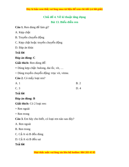 Đây là bản xem th , vu ử i lòng mua tài li u ệ đ xe ể m chi ti t (c ế ó l i ờ gi i ả ) Chủ đ 4. ề Vẽ kĩ thu t ậ ng d ứ ng ụ Bài 13. Bi u di ể n r ễ en Câu 1. Ren dùng đ l ề àm gì? A. Kẹp ch t ặ B. Truy n ề chuy n đ ể ng ộ C. K p ch ẹ t ặ ho c ặ truy n ề chuy n đ ể ng ộ D. Đáp án khác Trả l i ờ Đáp án đúng: C