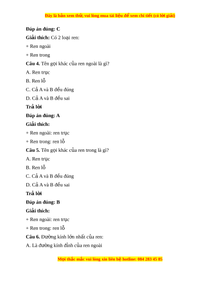 Giải thích: Có 2 lo i ạ ren: + Ren ngoài + Ren trong Câu 4. Tên g i ọ khác c a ủ ren ngoài là gì? A. Ren tr c ụ B. Ren lỗ C. Cả A và B đ u đúng ề D. C ả A và B đ u s ề ai Trả l i ờ Đáp án đúng: A Giải thích: + Ren ngoài: ren tr c ụ + Ren trong: ren lỗ Câu 5. Tên g i ọ khác c a ủ ren trong là gì? A. Ren tr c ụ B. Ren lỗ C. Cả A và B đ u đúng ề D. C ả A và B đ u s ề ai Trả l i ờ Đáp án đúng: B Giải thích: + Ren ngoài: ren tr c ụ + Ren trong: ren lỗ Câu 6. Đư ng ờ kính l n nh ớ t ấ c a r ủ en: A. Là đư ng kí ờ nh đ nh c ỉ a ủ ren ngoài M i