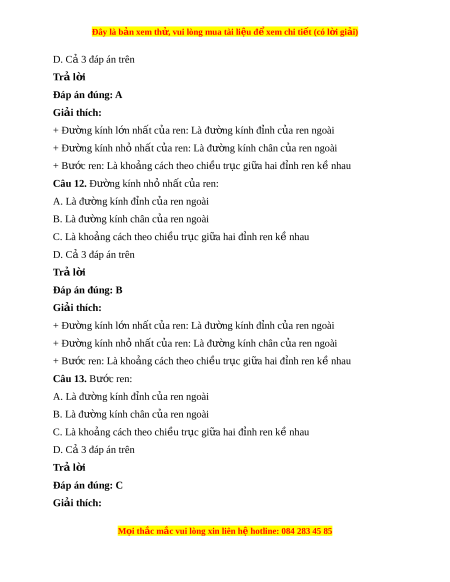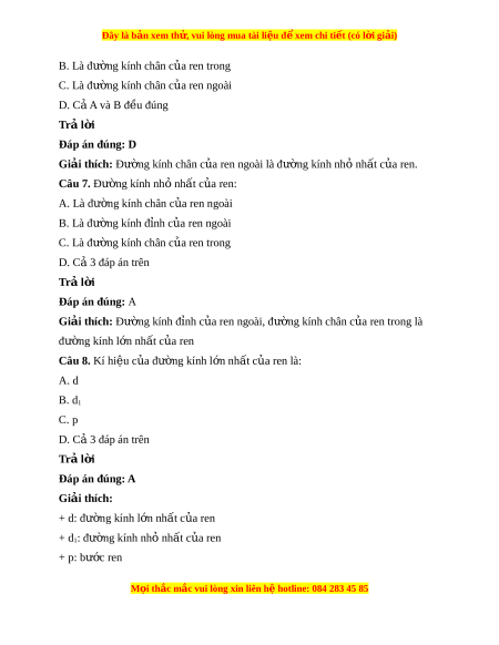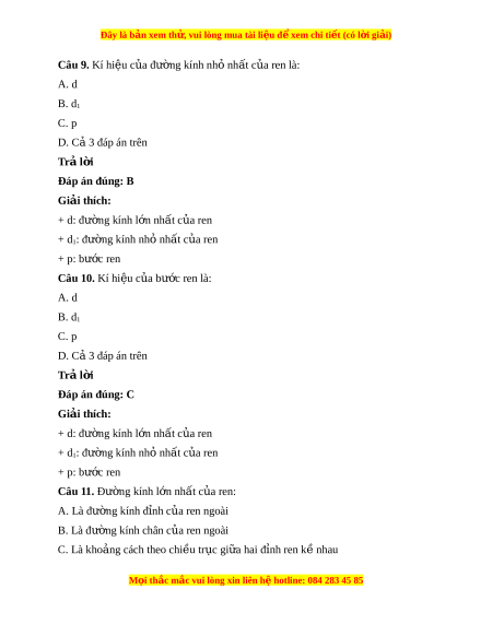 Đây là bản xem th , vu ử i lòng mua tài li u ệ đ xe ể m chi ti t (c ế ó l i ờ gi i ả ) Câu 9. Kí hi u c ệ a ủ đư ng kí ờ nh nh nh ỏ t ấ c a r ủ en là: A. d B. d1 C. p D. C 3 đáp án ả trên Trả l i ờ Đáp án đúng: B Giải thích: + d: đư ng ờ kính l n ớ nh t ấ c a ủ ren + d1: đư ng kí ờ nh nh nh ỏ t ấ c a r ủ en + p: bư c ớ ren Câu 10. Kí hi u c ệ a ủ bư c r ớ en là: A. d B. d1 C. p D. C 3 đáp án ả trên Trả l i ờ Đáp án đúng: C Giải thích: + d: đư ng ờ kính l n ớ nh t ấ c a ủ ren + d1: đư ng kí ờ nh nh nh ỏ t ấ c a r ủ en + p: bư c ớ ren Câu 11. Đư ng ờ kính l n nh ớ t ấ c a r ủ en: A. Là đư ng kí ờ nh đ nh c ỉ a ủ ren ngoài B. Là đư ng ờ kính chân c a ủ ren ngoài C. Là kho ng ả cách theo chi u ề tr c ụ gi a ữ hai đ nh r ỉ en k nhau ề M i