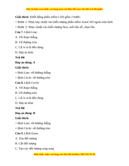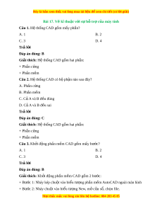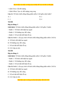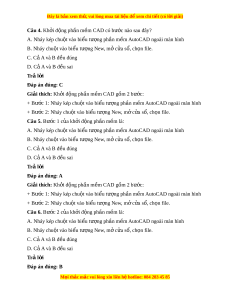 Đây là bản xem th , vu ử i lòng mua tài li u ệ đ xe ể m chi ti t (c ế ó l i ờ gi i ả ) Giải thích: Kh i ở đ ng ph ộ n m ầ m ề CAD g m ồ 2 bư c: ớ + Bư c 1: ớ Nháy kép chu t ộ vào bi u t ể ư ng ph ợ n m ầ m ề AutoCAD ngoài màn hình + Bư c 2: ớ Nháy chu t ộ vào bi u t ể ư ng N ợ ew, m c ở a s ử , ch ổ n ọ file. Câu 7. Lệnh Line: A. Vẽ đo n t ạ h ng ẳ B. V đ ẽ ư ng ờ tròn C. Cả A và B đ u đúng ề D. Đáp án khác Trả l i ờ Đáp án đúng: A Giải thích: + l nh L ệ ine: v đ ẽ ư ng ờ th ng ẳ + l nh C ệ ircle: v đ ẽ ư ng t ờ ròn Câu 8. Lệnh Circle: A. Vẽ đo n t ạ h ng ẳ B. V đ ẽ ư ng ờ tròn C. Cả A và B đ u đúng ề D. Đáp án khác Trả l i ờ Đáp án đúng: B Giải thích: + l nh L ệ ine: v đ ẽ ư ng ờ th ng ẳ + l nh C ệ ircle: v đ ẽ ư ng t ờ ròn Câu 9. Lệnh Erase: A. Xóa đối tư ng ợ B. C t ắ đối tư ng ợ C. T o các ạ đối tư ng ợ song song M i