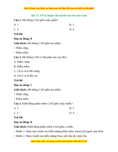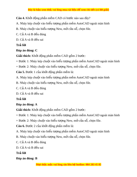 Đây là bản xem th , vu ử i lòng mua tài li u ệ đ xe ể m chi ti t (c ế ó l i ờ gi i ả ) Câu 4. Kh i ở đ ng ph ộ n m ầ m ề CAD có bư c ớ nào sau đây? A. Nháy kép chu t ộ vào bi u t ể ư ng ợ ph n m ầ m ề AutoCAD ngoài màn hình B. Nháy chu t ộ vào bi u ể tư ng N ợ ew, m c ở a ử s , ch ổ n f ọ ile. C. Cả A và B đ u đúng ề D. C ả A và B đ u s ề ai Trả l i ờ Đáp án đúng: C Giải thích: Kh i ở đ ng ph ộ n m ầ m ề CAD g m ồ 2 bư c: ớ + Bư c 1: ớ Nháy kép chu t ộ vào bi u t ể ư ng ph ợ n m ầ m ề AutoCAD ngoài màn hình + Bư c 2: ớ Nháy chu t ộ vào bi u t ể ư ng N ợ ew, m c ở a s ử , ch ổ n ọ file. Câu 5. Bư c 1 c ớ a ủ kh i ở đ ng ph ộ n m ầ m ề là: A. Nháy kép chu t ộ vào bi u t ể ư ng ợ ph n m ầ m ề AutoCAD ngoài màn hình B. Nháy chu t ộ vào bi u ể tư ng N ợ ew, m c ở a ử s , ch ổ n f ọ ile. C. Cả A và B đ u đúng ề D. C ả A và B đ u s ề ai Trả l i ờ Đáp án đúng: A Giải thích: Kh i ở đ ng ph ộ n m ầ m ề CAD g m ồ 2 bư c: ớ + Bư c 1: ớ Nháy kép chu t ộ vào bi u t ể ư ng ph ợ n m ầ m ề AutoCAD ngoài màn hình + Bư c 2: ớ Nháy chu t ộ vào bi u t ể ư ng N ợ ew, m c ở a s ử , ch ổ n ọ file. Câu 6. Bư c 2 c ớ a ủ kh i ở đ ng ph ộ n m ầ m ề là: A. Nháy kép chu t ộ vào bi u t ể ư ng ợ ph n m ầ m ề AutoCAD ngoài màn hình B. Nháy chu t ộ vào bi u ể tư ng N ợ ew, m c ở a ử s , ch ổ n f ọ ile. C. Cả A và B đ u đúng ề D. C ả A và B đ u s ề ai Trả l i ờ Đáp án đúng: B M i