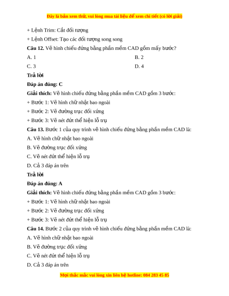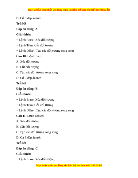 Đây là bản xem th , vu ử i lòng mua tài li u ệ đ xe ể m chi ti t (c ế ó l i ờ gi i ả ) D. C 3 đáp án ả trên Trả l i ờ Đáp án đúng: A Giải thích: + L nh E ệ rase: Xóa đ i ố tư ng ợ + L nh ệ Trim: C t ắ đ i ố tư ng ợ + L nh O ệ ffset: T o các ạ đ i ố tư ng ợ song song Câu 10. Lệnh Trim: A. Xóa đối tư ng ợ B. C t ắ đối tư ng ợ C. T o các ạ đối tư ng ợ song song D. C 3 đáp án ả trên Trả l i ờ Đáp án đúng: B Giải thích: + L nh E ệ rase: Xóa đ i ố tư ng ợ + L nh ệ Trim: C t ắ đ i ố tư ng ợ + L nh O ệ ffset: T o các ạ đ i ố tư ng ợ song song Câu 11. Lệnh Offset: A. Xóa đối tư ng ợ B. C t ắ đối tư ng ợ C. T o các ạ đối tư ng ợ song song D. C 3 đáp án ả trên Trả l i ờ Đáp án đúng: C Giải thích: + L nh E ệ rase: Xóa đ i ố tư ng ợ M i