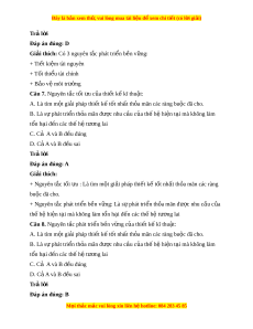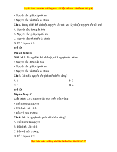 Giải thích: Có 3 nguyên t c ắ phát tri n ể b n v ề ng: ữ + Ti t ế ki m ệ tài nguyên + Tối thi u t ể ài chính + B o v ả m ệ ôi trư ng ờ Câu 7. Nguyên t c t ắ ối u c ư a t ủ hi t ế k kĩ ế thu t ậ : A. Là tìm m t ộ gi i ả pháp thi t ế k t ế t ố nh t ấ th a m ỏ ãn các ràng bu c ộ đã cho. B. Là s phát ự tri n t ể h a m ỏ ãn đư c ợ nhu c u c ầ a t ủ h h ế hi ệ n t ệ i ạ mà không làm tổn h i ạ đ n các ế th h ế t ệ ư ng l ơ ai C. Cả A và B đ u đúng ề D. C ả A và B đ u s ề ai Trả l i ờ Đáp án đúng: A Giải thích: + Nguyên tắc tối u : ư Là tìm m t ộ gi i ả pháp thi t ế k t ế t ố nh t ấ th a m ỏ ãn các ràng bu c ộ đã cho. + Nguyên tắc phát tri n b ể n v ề ng: ữ Là s phát ự tri n t ể h a m ỏ ãn đư c ợ nhu c u c ầ a ủ th h ế ệ hiện t i ạ mà không làm tổn h i ạ đ n ế các th h ế t ệ ư ng l ơ ai
