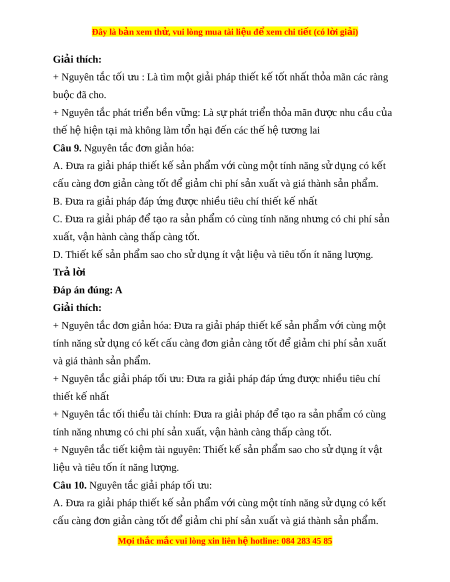 Đây là bản xem th , vu ử i lòng mua tài li u ệ đ xe ể m chi ti t (c ế ó l i ờ gi i ả ) Giải thích: + Nguyên tắc tối u : ư Là tìm m t ộ gi i ả pháp thi t ế k t ế t ố nh t ấ th a m ỏ ãn các ràng bu c ộ đã cho. + Nguyên tắc phát tri n b ể n v ề ng: ữ Là s phát ự tri n t ể h a m ỏ ãn đư c ợ nhu c u c ầ a ủ th h ế ệ hiện t i ạ mà không làm tổn h i ạ đ n ế các th h ế t ệ ư ng l ơ ai Câu 9. Nguyên t c đ ắ n gi ơ n ả hóa: A. Đ a ư ra gi i ả pháp thi t ế k s ế n ph ả m ẩ v i ớ cùng m t ộ tính năng s d ử ng có k ụ t ế cấu càng đ n gi ơ n càng ả tốt đ gi ể m ả chi phí s n ả xu t ấ và giá thành s n ả ph m ẩ . B. Đ a r ư a gi i ả pháp đáp ng đ ứ ư c nhi ợ u t ề iêu chí thi t ế k nh ế t ấ C. Đ a r ư a gi i ả pháp để t o r ạ a s n ả ph m