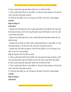 ẩ có cùng tính năng nh ng có chi ư phí s n ả xuất, v n hành ậ càng th p càng t ấ t ố . D. Thi t ế kế s n ả ph m ẩ sao cho sử d ng í ụ t v t ậ li u và t ệ iêu t n í ố t năng lư ng. ợ Trả l i ờ Đáp án đúng: A Giải thích: + Nguyên tắc đ n gi ơ n ả hóa: Đ a r ư a gi i ả pháp thi t ế k s ế n ả ph m ẩ v i ớ cùng m t ộ tính năng sử d ng có k ụ t ế c u càng ấ đ n gi ơ n càng ả t t ố đ gi ể m ả chi phí s n ả xu t ấ và giá thành s n ả ph m ẩ . + Nguyên tắc gi i ả pháp t i ố u: ư Đ a ư ra gi i ả pháp đáp ng đ ứ ư c ợ nhi u t ề iêu chí thi t ế k nh ế t ấ + Nguyên tắc tối thi u ể tài chính: Đ a r ư a gi i ả pháp đ t ể o ạ ra s n ả ph m ẩ có cùng tính năng nh ng có ư chi phí s n ả xu t ấ , v n ậ hành càng th p càng t ấ t ố . + Nguyên tắc ti t ế ki m ệ tài nguyên: Thi t ế k s ế n ả ph m ẩ sao cho s d ử ng í ụ t v t ậ li u và t ệ iêu tốn ít năng lư ng. ợ Câu 10. Nguyên t c gi ắ i ả pháp t i ố u: ư A. Đ a ư ra gi i ả pháp thi t ế k s ế n ph ả m ẩ v i ớ cùng m t ộ tính năng s d ử ng có k ụ t ế cấu càng đ n gi ơ n càng ả tốt đ gi ể m ả chi phí s n ả xu t ấ và giá thành s n ả ph m ẩ . M i