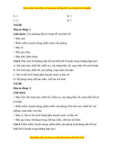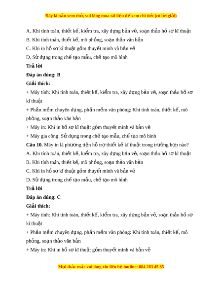 ề văn phòng: Khi tính toán, thi t ế k , m ế ô ph ng, ỏ so n ạ th o ả văn b n ả + Máy in: Khi in h s ồ kĩ ơ thu t ậ g m ồ thuy t ế minh và b n v ả ẽ + Máy gia công: S d ử ng t ụ rong ch t ế o m ạ u, ch ẫ t ế o ạ mô hình Câu 9. Ph n m ầ m ề chuyên d ng, ph ụ n m ầ m ề văn phòng là phư ng ơ ti n h ệ t ỗ r ợ thi t ế k kĩ ế thu t ậ trong trư ng h ờ p nào? ợ M i