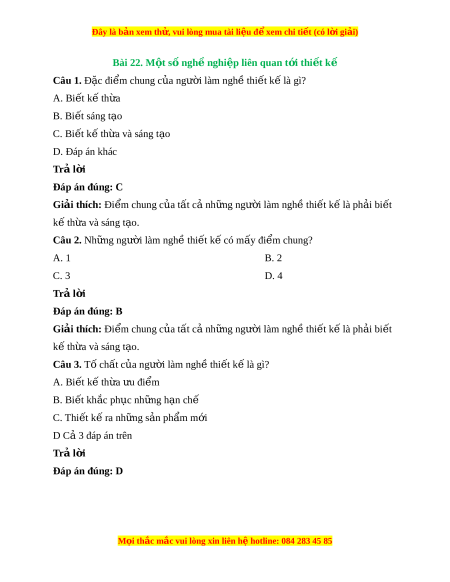 Đây là bản xem th , vu ử i lòng mua tài li u ệ đ xe ể m chi ti t (c ế ó l i ờ gi i ả ) Bài 22. M t ộ số ngh nghi ề p l ệ iên quan t i ớ thi t ế kế Câu 1. Đặc đi m ể chung c a ủ ngư i ờ làm ngh t ề hi t ế k l ế à gì? A. Bi t ế k t ế h a ừ B. Bi t ế sáng t o ạ C. Bi t ế k t ế h a ừ và sáng t o ạ D. Đáp án khác Trả l i ờ Đáp án đúng: C Giải thích: Đi m ể chung c a ủ tất cả nh ng ng ữ ư i ờ làm ngh t ề hi t ế k l ế à ph i ả bi t ế k t ế h a ừ và sáng t o. ạ Câu 2. Nh ng ữ ngư i ờ làm ngh t ề hi t ế k có ế m y đi ấ m ể chung? A. 1 B. 2 C. 3 D. 4 Trả l i ờ Đáp án đúng: B Giải thích: Đi m ể chung c a ủ tất cả nh ng ng ữ ư i ờ làm ngh t ề hi t ế k l ế à ph i ả bi t ế k t ế h a ừ và sáng t o. ạ Câu 3. T ch ố ất c a ủ ngư i ờ làm ngh t ề hi t ế k l ế à gì? A. Bi t ế k t ế h a ừ u đi ư m ể B. Bi t ế kh c ắ ph c nh ụ ng h ữ n ạ chế C. Thi t ế k r ế a nh ng s ữ n ả ph m ẩ m i ớ D C 3 đáp án ả trên Trả l i ờ Đáp án đúng: D M i