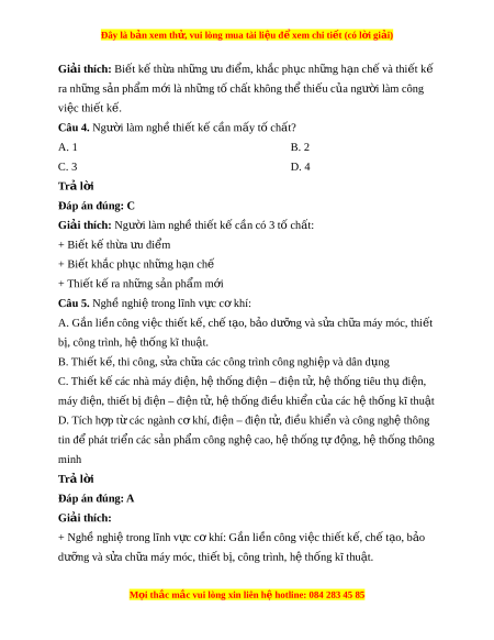 Đây là bản xem th , vu ử i lòng mua tài li u ệ đ xe ể m chi ti t (c ế ó l i ờ gi i ả ) Giải thích: Bi t ế k t ế h a ừ nh ng ữ u đi ư m ể , kh c ắ ph c nh ụ ng h ữ n ạ ch và t ế hi t ế kế ra nh ng s ữ n ph ả ẩm m i ớ là nh ng t ữ ố chất không th t ể hi u c ế a ng ủ ư i ờ làm công việc thi t ế k . ế Câu 4. Ngư i ờ làm ngh t ề hi t ế k c ế n m ầ y t ấ ch ố t ấ ? A. 1 B. 2 C. 3 D. 4 Trả l i ờ Đáp án đúng: C Giải thích: Ngư i ờ làm ngh t ề hi t ế k c ế n có ầ 3 t ch ố t ấ : + Bi t ế k t ế h a ừ u đi ư m ể + Bi t ế kh c ph ắ c ụ nh ng h ữ n ch ạ ế + Thi t ế k r ế a nh ng s ữ n ph ả m ẩ m i ớ Câu 5. Nghề nghi t ệ rong lĩnh v c c ự khí ơ : A. G n ắ li n công vi ề c t ệ hi t ế k , ch ế t ế o, ạ b o d ả ư ng ỡ và s a ử ch a m ữ áy móc, thi t ế bị, công trình, h t ệ h ng kĩ ố thu t ậ . B. Thi t ế k , t ế hi công, s a ử ch a các ữ