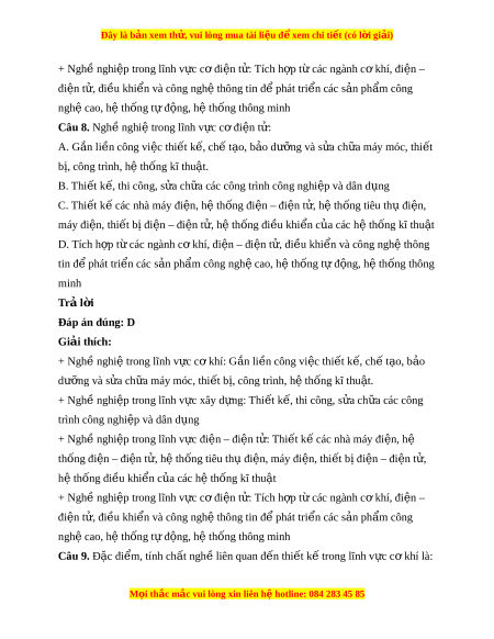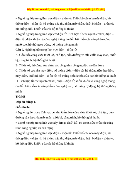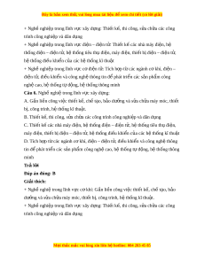 Đây là bản xem th , vu ử i lòng mua tài li u ệ đ xe ể m chi ti t (c ế ó l i ờ gi i ả ) + Ngh nghi ề p t ệ rong lĩnh v c đi ự n – đi ệ n t ệ : ử Thi t ế k các nhà m ế áy đi n, h ệ ệ thống đi n – đi ệ n t ệ , h ử t ệ hống tiêu th đi ụ n, m ệ áy đi n, t ệ hi t ế b đi ị n – đi ệ n t ệ , ử hệ thống đi u khi ề n c ể a các ủ hệ thống kĩ thu t ậ + Ngh nghi ề p t ệ rong lĩnh v c c ự đi ơ n t ệ : ử Tích h p t ợ các ừ ngành c kh ơ í, đi n – ệ điện t , đi ử u khi ề n và công ể nghệ thông tin đ phát ể tri n các ể s n ả ph m ẩ công nghệ cao, hệ thống t đ ự ng, h ộ t ệ hống thông minh Câu 7. Nghề nghi t ệ rong lĩnh v c đi ự n – đi ệ n t ệ : ử A. G n ắ li n công vi ề c t ệ hi t ế k , ch ế t ế o, ạ b o d ả ư ng ỡ và s a ử ch a m ữ áy móc, thi t ế bị, công trình, h t ệ h ng kĩ ố thu t ậ . B. Thi t ế k , t ế hi công, s a ử ch a các ữ