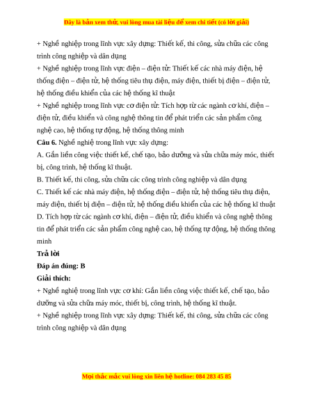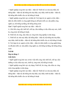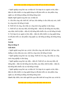 Đây là bản xem th , vu ử i lòng mua tài li u ệ đ xe ể m chi ti t (c ế ó l i ờ gi i ả ) + Ngh nghi ề p t ệ rong lĩnh v c xây d ự ng: ự Thi t ế k , t ế hi công, s a ch ử a ữ các công trình công nghi p và dân d ệ ng ụ + Ngh nghi ề p t ệ rong lĩnh v c đi ự n – đi ệ n t ệ : ử Thi t ế k các nhà m ế áy đi n, h ệ ệ thống đi n – đi ệ n t ệ , h ử t ệ hống tiêu th đi ụ n, m ệ áy đi n, t ệ hi t ế b đi ị n – đi ệ n t ệ , ử hệ thống đi u khi ề n c ể a các ủ hệ thống kĩ thu t ậ + Ngh nghi ề p t ệ rong lĩnh v c c ự đi ơ n t ệ : ử Tích h p t ợ các ừ ngành c kh ơ í, đi n – ệ điện t , đi ử u khi ề n và công ể nghệ thông tin đ phát ể tri n các ể s n ả ph m ẩ công nghệ cao, hệ thống t đ ự ng, h ộ t ệ hống thông minh Câu 6. Nghề nghi t ệ rong lĩnh v c xây d ự ng: ự A. G n ắ li n công vi ề c t ệ hi t ế k , ch ế t ế o, ạ b o d ả ư ng ỡ và s a ử ch a m ữ áy móc, thi t ế bị, công trình, h t ệ h ng kĩ ố thu t ậ . B. Thi t ế k , t ế hi công, s a ử ch a các ữ