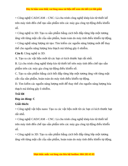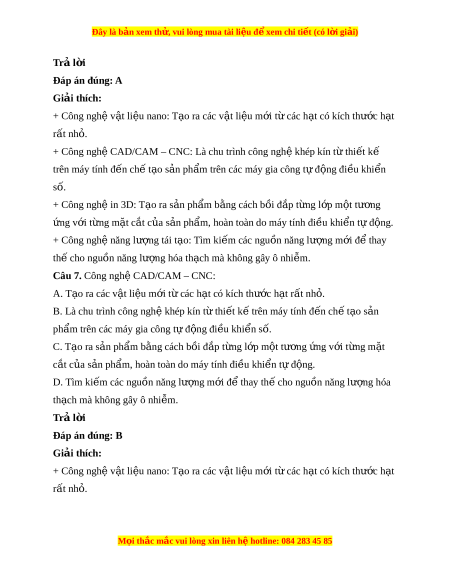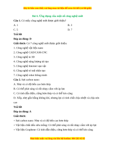 Đây là bản xem th , vu ử i lòng mua tài li u ệ đ xe ể m chi ti t (c ế ó l i ờ gi i ả ) Trả l i ờ Đáp án đúng: A Giải thích: + Công ngh v ệ t ậ li u nano: ệ T o r ạ a các v t ậ li u m ệ i ớ t các h ừ t ạ có kích thư c h ớ t ạ rất nh . ỏ + Công ngh C