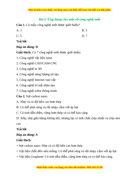 Giải thích: Có 7 công nghệ m i ớ đư c ợ gi i ớ thi u: ệ 1. Công ngh v ệ t ậ li u nano ệ 2. Công ngh C ệ AD/CAM-CNC 3. Công ngh i ệ n 3D 4. Công ngh năng l ệ ư ng t ợ ái t o ạ 5. Công ngh I ệ nternet v n v ạ t ậ 6. Công ngh t ệ rí tu nhân t ệ o ạ 7. Công ngh r ệ obot thông minh Câu 2. S i ợ carbon nano: A. Nhẹ và có đ b ộ n cao h ề n ơ thép B. Có th phát ể sáng và r t ấ nh y ạ c m ả v i ớ áp l c ự C. Có tính d n đi ẫ n, c ệ ng ứ h n t ơ hép và có th kéo căng ể