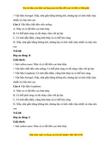 Đây là bản xem th , vu ử i lòng mua tài li u ệ đ xe ể m chi ti t (c ế ó l i ờ gi i ả ) + V t ậ li u ệ Aerogel: X p, nh ố g ẹ n b ầ ng ằ không khí, nh ng l ư i ạ có tính ch t ấ ch u ị nhiệt và chịu nén cao Câu 3. V t ậ li u ch ệ t ấ d o s ẻ iêu m ng: ỏ A. Nhẹ và có đ b ộ n cao h ề n ơ thép B. Có th phát ể sáng và r t ấ nh y ạ c m ả v i ớ áp l c ự C. Có tính d n đi ẫ n, c ệ ng ứ h n t ơ hép và có th kéo căng ể