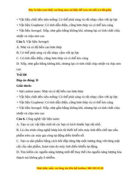Đây là bản xem th , vu ử i lòng mua tài li u ệ đ xe ể m chi ti t (c ế ó l i ờ gi i ả ) + V t ậ li u ch ệ t ấ d o s ẻ iêu m ng: ỏ Có th phát ể sáng và r t ấ nh y c ạ m ả v i ớ áp l c ự + V t ậ li u G ệ raphene: Có tính d n đi ẫ n, c ệ ng h ứ n t ơ hép và có th kéo căng ể + V t ậ li u ệ Aerogel: X p, nh ố g ẹ n b ầ ng ằ không khí, nh ng l ư i ạ có tính ch t ấ ch u ị nhiệt và chịu nén cao Câu 5. V t ậ li u ệ Aerogel: A. Nhẹ và có đ b ộ n cao h ề n ơ thép B. Có th phát ể sáng và r t ấ nh y ạ c m ả v i ớ áp l c ự C. Có tính d n đi ẫ n, c ệ ng ứ h n t ơ hép và có th kéo căng ể