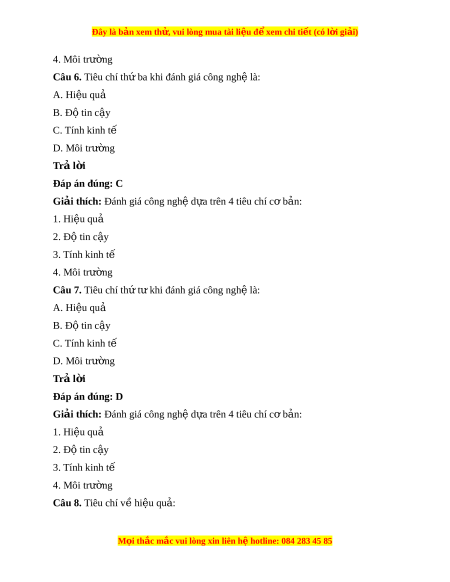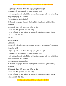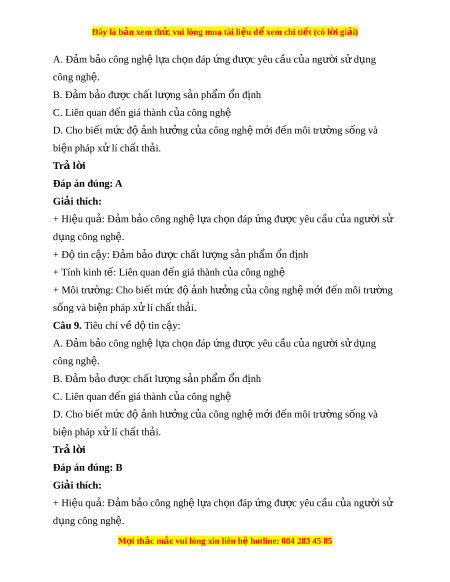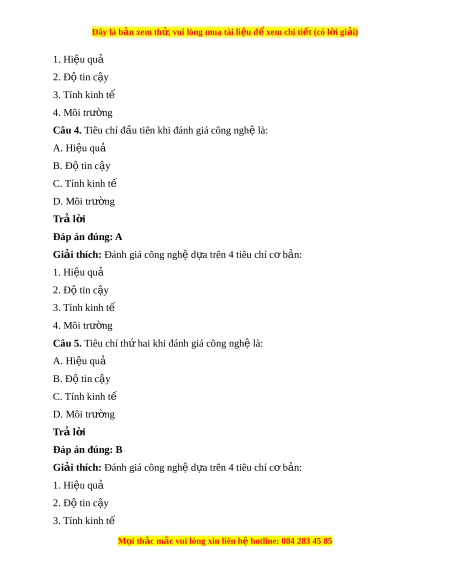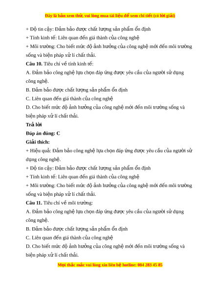 Đây là bản xem th , vu ử i lòng mua tài li u ệ đ xe ể m chi ti t (c ế ó l i ờ gi i ả ) A. Đ m ả b o công ả ngh l ệ a ự ch n đáp ọ ng đ ứ ư c ợ yêu c u c ầ a ủ ngư i ờ s d ử ng ụ công nghệ. B. Đ m ả b o ả đư c ch ợ t ấ lư ng s ợ n ph ả m ẩ n đ ổ nh ị C. Liên quan đ n ế giá thành c a công ngh ủ ệ D. Cho bi t ế m c đ ứ ộ nh ả hư ng c ở a ủ công ngh m ệ i ớ đ n m ế ôi trư ng ờ s ng và ố biện pháp x l ử í ch t ấ th i ả . Trả l i ờ Đáp án đúng: A Giải thích: + Hi u qu ệ : ả Đ m ả b o công ả ngh l ệ a ự ch n đáp ọ ng đ ứ ư c yêu c ợ u c ầ a ủ ngư i ờ s ử d ng công ụ ngh . ệ + Độ tin c y: ậ Đ m ả b o ả đư c ợ ch t ấ lư ng ợ s n ả ph m ẩ n đ ổ nh ị + Tính kinh t : ế Liên quan đ n gi ế á thành c a ủ công nghệ + Môi trư ng: ờ Cho bi t ế m c đ ứ ộ nh ả hư ng c ở a ủ công ngh m ệ i ớ đ n m ế ôi trư ng ờ sống và bi n pháp ệ x l ử í ch t ấ th i ả . Câu 9. Tiêu chí v đ ề t ộ in c y: ậ A. Đ m ả b o công ả ngh l ệ a ự ch n đáp ọ ng đ ứ ư c ợ yêu c u c ầ a ủ ngư i ờ s d ử ng ụ công nghệ. B. Đ m ả b o ả đư c ch ợ t ấ lư ng s ợ n ph ả m ẩ n đ ổ nh ị C. Liên quan đ n ế giá thành c a công ngh ủ ệ D. Cho bi t ế m c đ ứ ộ nh ả hư ng c ở a ủ công ngh m ệ i ớ đ n m ế ôi trư ng ờ s ng và ố biện pháp x l ử í ch t ấ th i ả . Trả l i ờ Đáp án đúng: B Giải thích: + Hi u qu ệ : ả Đ m ả b o công ả ngh l ệ a ự ch n đáp ọ ng đ ứ ư c yêu c ợ u c ầ a ủ ngư i ờ s ử d ng công ụ ngh . ệ M i