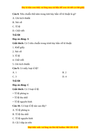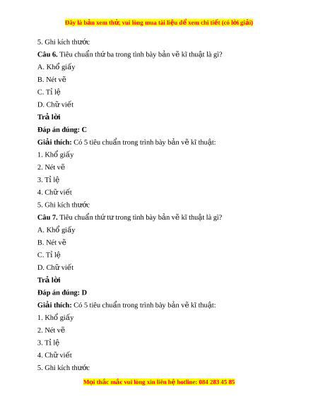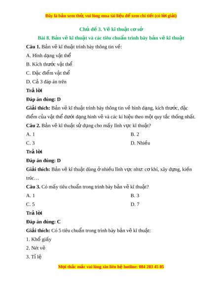 ậ trình bày thông tin v hì ề nh d ng, ạ kích thư c, đ ớ c ặ đi m ể c a ủ v t ậ th d ể ư i ớ d ng hì ạ nh v và các ẽ kí hi u t ệ heo m t ộ quy t c ắ th ng nh ố t ấ . Câu 2. B n v ả ẽ kĩ thu t ậ sử d ng cho m ụ ấy lĩnh v c kĩ ự thu t ậ ? A. 1 B. 2 C. 3 D. Nhi u ề Trả l i ờ Đáp án đúng: D Giải thích: B n ả v k ẽ ĩ thu t ậ dùng nhi ở u l ề ĩnh v c nh ự : ư c khí ơ , xây d ng, ki ự n ế trúc…
