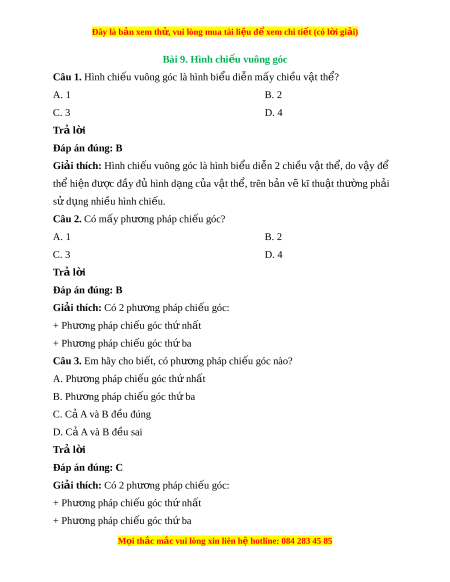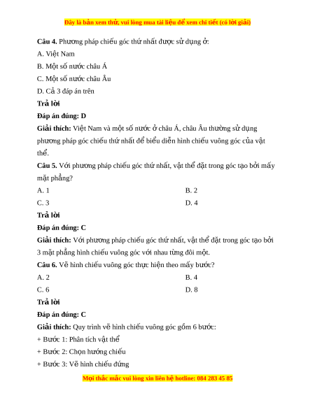 Giải thích: Việt Nam và m t ộ số nư c ớ châu Á ở , châu Âu thư ng s ờ ử d ng ụ phư ng ơ pháp góc chi u t ế h nh ứ t ấ đ bi ể u di ể n hì ễ nh chi u ế vuông góc c a v ủ t ậ th . ể Câu 5. V i ớ phư ng pháp chi ơ u góc ế thứ nh t ấ , v t ậ th đ ể t ặ trong góc t o b ạ i ở m y ấ m t ặ ph ng? ẳ A. 1 B. 2 C. 3 D. 4 Trả l i ờ Đáp án đúng: C Giải thích: V i ớ phư ng pháp ơ chi u góc t ế h nh ứ t ấ , v t ậ th đ ể t ặ trong góc t o ạ b i ở 3 m t ặ ph ng hì ẳ nh chi u vuông góc v ế i ớ nhau t ng đôi ừ m t ộ .