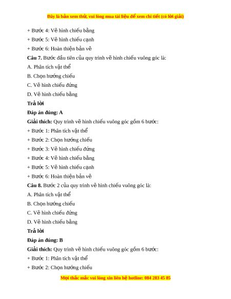Đây là bản xem th , vu ử i lòng mua tài li u ệ đ xe ể m chi ti t (c ế ó l i ờ gi i ả ) + Bư c 4: ớ V h ẽ ình chi u ế b ng ằ + Bư c 5: ớ V h ẽ ình chi u ế c nh ạ + Bư c 6: ớ Hoàn thi n b ệ n ả vẽ Câu 7. Bư c đ ớ ầu tiên c a ủ quy trình v hì ẽ nh chi u vuông góc l ế à: A. Phân tích v t ậ thể B. Ch n h ọ ư ng ớ chi u ế C. V hì ẽ nh chi u đ ế ng ứ D. Vẽ hình chi u b ế ng ằ Trả l i ờ Đáp án đúng: A