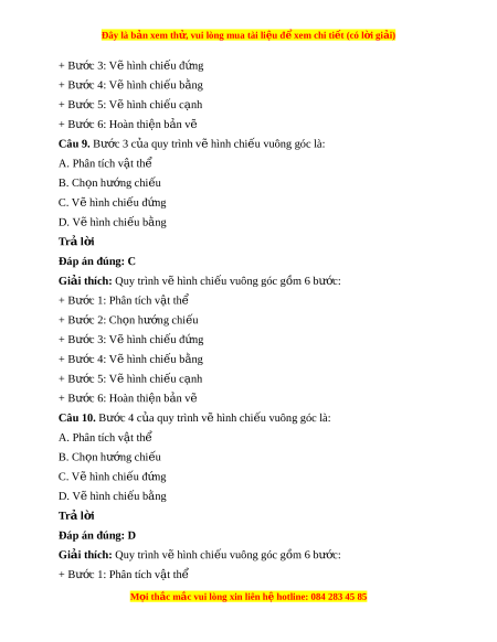 Đây là bản xem th , vu ử i lòng mua tài li u ệ đ xe ể m chi ti t (c ế ó l i ờ gi i ả ) + Bư c 3: ớ V h ẽ ình chi u ế đ ng ứ + Bư c 4: ớ V h ẽ ình chi u ế b ng ằ + Bư c 5: ớ V h ẽ ình chi u ế c nh ạ + Bư c 6: ớ Hoàn thi n b ệ n ả vẽ Câu 9. Bư c 3 c ớ a ủ quy trình v hì ẽ nh chi u vuông góc l ế à: A. Phân tích v t ậ thể B. Ch n h ọ ư ng ớ chi u ế C. V hì ẽ nh chi u đ ế ng ứ D. Vẽ hình chi u b ế ng ằ Trả l i ờ Đáp án đúng: C