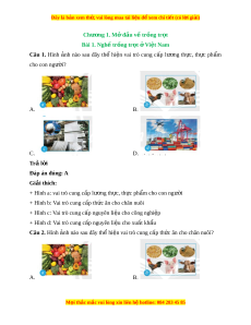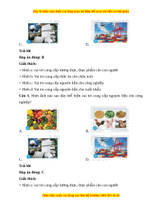 Đây là bản xem th , vu ử i lòng mua tài li u ệ đ xe ể m chi ti t (c ế ó l i ờ gi i ả ) Chư ng ơ 1. M đ ở ầu v t ề r ng t ồ r t ọ Bài 1. Ngh t ề r ng ồ tr t ọ ở Vi t ệ Nam Câu 1. Hình nh ả nào sau đây thể hi n ệ vai trò cung c p ấ lư ng ơ th c, ự th c ự ph m ẩ cho con ngư i ờ ? A. B. C. D. Trả l i ờ Đáp án đúng: A Giải thích: + Hình a: vai trò cung c p l ấ ư ng t ơ h c, ự th c ự ph m ẩ cho con ngư i ờ + Hình b: Vai trò cung c p t ấ h c ăn cho chăn ứ nuôi