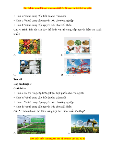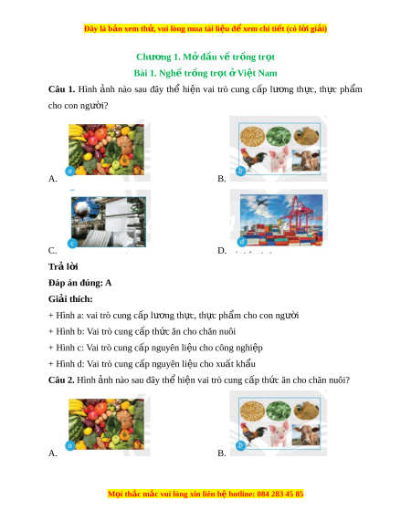 Đây là bản xem th , vu ử i lòng mua tài li u ệ đ xe ể m chi ti t (c ế ó l i ờ gi i ả ) C. D. Trả l i ờ Đáp án đúng: B Giải thích: + Hình a: vai trò cung c p l ấ ư ng t ơ h c, ự th c ự ph m ẩ cho con ngư i ờ + Hình b: Vai trò cung c p t ấ h c ăn cho chăn ứ nuôi