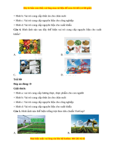 + Hình d: Vai trò cung c p nguyên l ấ i u cho xu ệ t ấ kh u ẩ Câu 3. Hình nh ả nào sau đây thể hi n ệ vai trò cung c p ấ nguyên li u ệ cho công nghiệp? A. B. C. D. Trả l i ờ Đáp án đúng: C Giải thích: + Hình a: vai trò cung c p l ấ ư ng t ơ h c, ự th c ự ph m ẩ cho con ngư i ờ M i